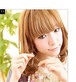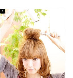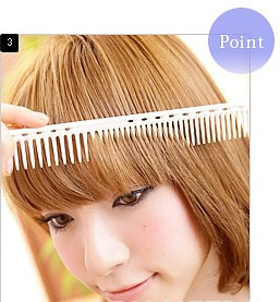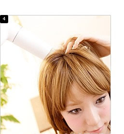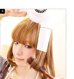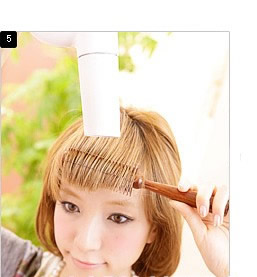 STEP 5: 然后把电吹风调至热风状态,一边用梳子向内卷曲,一边用电吹风为刘海加热定型。