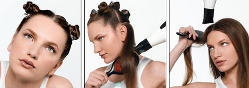飘而柔的直发 晋级玉女章门 如图从左至右: 1 中分,将左右两侧潮湿的头发拧成一股盘住,用发卡固定;后面头发水平分成3份,拧好固定,留出最下面的头发待吹。 2 在留出的头发上涂抹润发精华,再用大发刷边梳边从发根吹至发梢。试试LOREAL可丽雅系列倍顺润发凝露,可顺滑、调理发丝,避免吹风带来的毛躁。 3 自下而上逐一松开发髻,涂抹适量润发精华后吹干。吹风时需向下轻拉发根。
