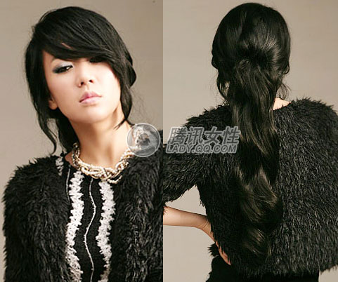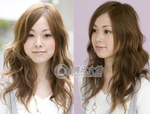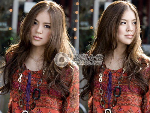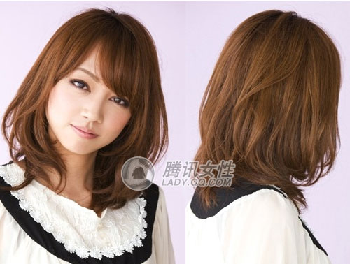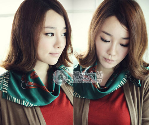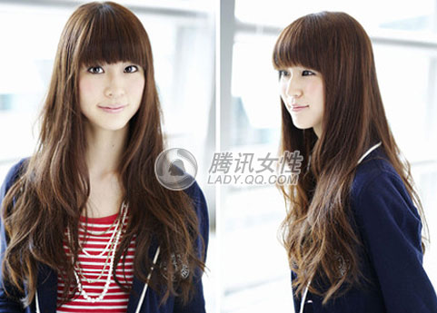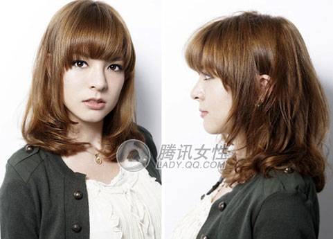 针对问题:圆脸、宽额头、宽颧骨 长斜刘海可以最大程度的修饰宽额头,这点的不用再多说了。而脸颊两侧的头发是否要往耳后带呢?其实侧发是一个帮助小脸的好办法。利用好两颊的发片,可是能够让你瞬间瘦脸哦!利用卷发棒,将脸颊的发须弄成向内微卷的发束,下端的发须的卷度要向内,然后向下,这样,颧骨两侧的发须可以有效遮盖脸侧的肉肉。下巴以下的发束因为向下的趋势,在视觉上将脸型拉长。两者结合,就能够达到瞬间瘦脸的效果了。 瘦脸Style:长齐刘海+内卷J型侧发 让圆脸变瘦长