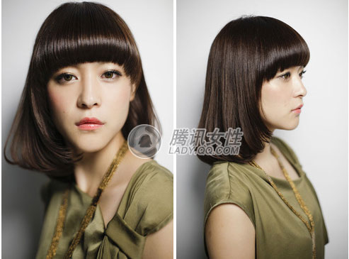 针对问题:长脸、宽额头 厚重的齐刘海是“瘦脸发型”的安全选择。整体发流向内,两鬓处的较长发丝能勾勒出面部的轮廓,适合修饰长形脸庞。而遮住眉头的长刘海也能缩短脸的长度。厚重的齐刘海带给人一种甜美感觉,并且更加凸显了眼睛给人的印象,配合明亮的眼妆,轻松打造清纯甜美的淑女造型。 瘦脸Style:斜刘海+反翘“小伞头” 打造菱形黄金比例