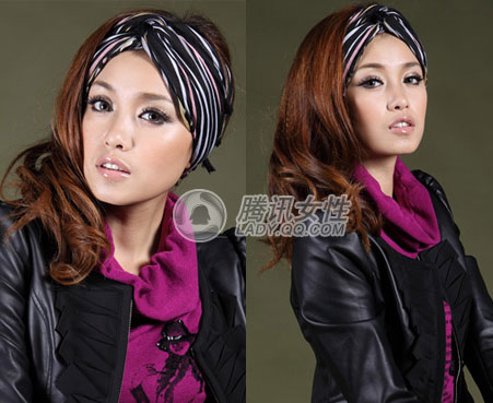 针对问题:宽额头、宽颧骨 适合额头和颧骨较宽的倒三角脸型。如果你的刘海和前发造型本身没有办法帮助遮掩脸部,可以尝试利用头巾来修饰线条。以“人”字形的轮廓来包裹额头和两侧颧骨肌肤,打造出最惹人爱的菱形小脸线条。注意选择与服装风格相称的头巾花色。 瘦脸Style:“人”字型长刘海 掩盖腮骨