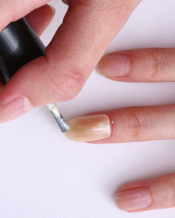 第一步:给指甲打上底色,先从中间局部指根涂向指尖,然后以同样的方法涂抹左右两侧