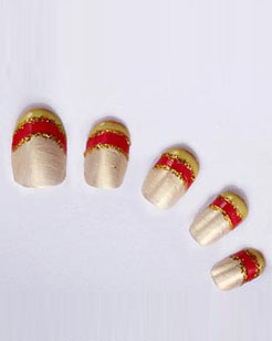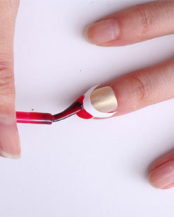 第三步:红色的甲油按照左右两边,涂满辅佐粘纸前端的部位,指甲干后才干撕去粘纸。