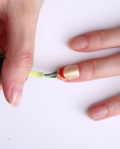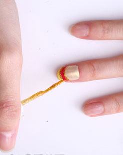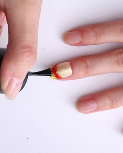 第四步:黄色指甲油同样的手法,涂抹指甲的前端,比例与红色一样