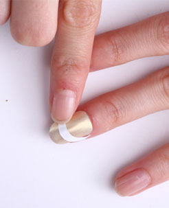 第二步:辅佐粘纸贴指甲天然分界线处,要细心粘紧,不能留有缝隙。