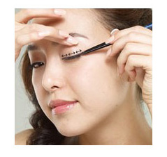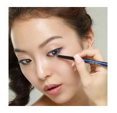 1、首先用液体眼线笔沿着上睫毛根部描画眼线,注意透明眼妆强调的是若有若无的透明感,眼线一定要沿着睫毛根部填满缝隙,避免出现留白。绘出的流线感造型,不要太粗,尽量一气呵成。