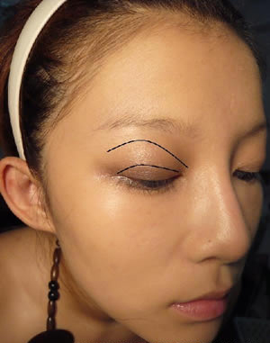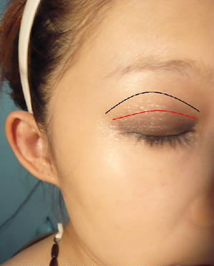 眼妆画法DIY步骤 4:现在开始加深色,图片中上面一条是浅色眼影的位置,比较靠睫毛根部的是深色眼影的位置,第一次加深色的时候不要下手太重,记住颜色是要慢慢堆叠的,建议大家可以使用眼影棒,这样比较不容易掉落粉末。