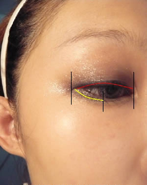 眼妆画法DIY步骤 9:这次的眼线走一个眼尾拉长的感觉,所以再打底的时候,上眼线是从眼头画到眼尾,而下眼线则是从眼珠中间的位置开始画到眼尾。