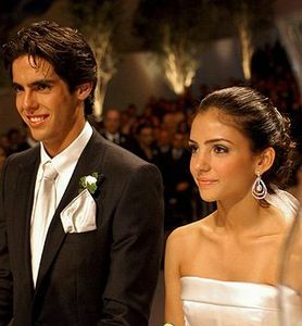 巴西·卡卡妻子卡洛琳 妆容特色:这款新娘妆无论是礼服、发式、还是妆容,与卡洛琳的气质十分搭配。在妆容上,蓝色眼影的涂抹增加了眼睛的深邃度,珊瑚色的腮红和粉色唇彩透出新娘的美丽心情。