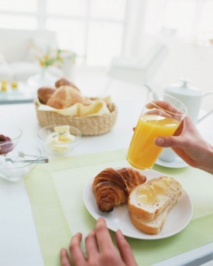 早餐: 鲜榨的橘汁、麦片粥(先把燕麦在牛奶中浸泡一晚上,再和切碎的苹果丁、淡黄葡萄干、一点麦芽、一勺蜂蜜一起熬成粥),抹一点黄油的烤面包,绿茶。 这是一份高谷物、高纤维的早餐。麦片粥可以帮助你降低胆固醇;麦芽富含维生素E;两份饮料——绿茶和鲜橘汁,含大量的维生素。