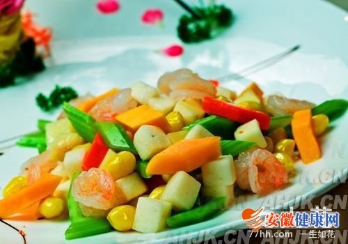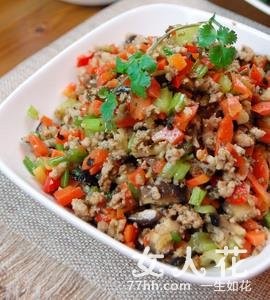 四、胡萝卜玉米笋炒火腿 原料:胡萝卜、玉米笋、山药、火腿、杏仁、青椒、寿司腌萝卜、葱花、盐、鸡精、绍酒、白糖 百里香。 做法: 1、胡萝卜、玉米笋、山药去皮、切丁,火腿、青椒、腌萝卜切丁; 2、山药丁、玉米笋飞水捞出; 3、锅内放油,煸香葱花,煸炒胡萝卜放入火腿丁烹入绍酒加青椒翻炒; 4、放入山药、玉米笋、腌萝卜丁,加少许盐、鸡精、糖调味撒上杏仁、 鲜百里香即可。