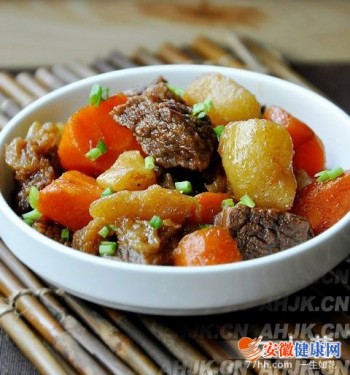 三、土豆胡萝卜烧牛肉 原料:牛肉400克、土豆1个、胡萝卜2个、生抽、老抽葱、姜、花椒、八角适量、盐、鸡精、糖少许。 做法: 1、牛肉切成1厘米见方的块,飞水; 2、锅中油热后,放入花椒、八角、葱、姜炒出香味后,放入牛肉翻炒均匀; 3、烹入料酒,放入生抽2茶匙、老抽1茶匙,翻炒均匀后,倒入足量热水没过牛肉,大火煮沸,小火继续煮45分钟; 4、土豆切滚刀块放入锅中; 5、胡萝卜切滚刀块放入锅中继续煮25分钟,加盐、鸡精、糖翻炒均匀,收至汤汁浓稠即可[page]