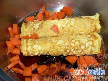 五、胡萝卜苹果红枣糖水 原料:胡萝卜、苹果、去核红枣、冰糖。 做法: 1、胡萝卜、苹果洗净去皮,苹果去皮后要泡在清水中以免氧化发黑;红枣洗净沥干; 2、煮锅中加水,依次放入胡萝卜、红枣、苹果、冰糖,一共煮大约10分钟即可。 六、胡萝卜炒海带丝 原料: 胡萝卜一根、海带150克、洋葱1/2个、蒜一瓣、米醋1/4茶匙、糖1/4茶匙、盐1/2茶匙、生抽1/2茶匙。 做法: 1、胡萝卜洗净,去皮,切成丝,海带切成丝,洋葱切成丝,蒜切片; 2、锅中烧热油,下蒜片爆香,再下胡萝卜丝炒至油脂呈金黄色; 3、下洋葱和海带丝,淋入米醋,调入糖,翻炒至软身,最后调入盐和生抽,炒匀出锅。[page]