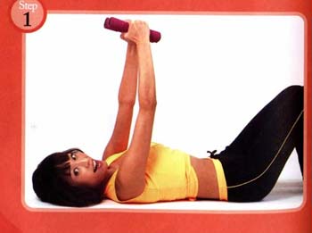 〔步骤1〕身体平躺,将手臂打直举起哑铃,双手臂与身体成90度。