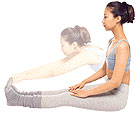 (吸气)双腿伸直,脚腕保持直角。将脚掌贴在墙壁上亦可。保持姿势吸气。 (呼气)保持膝盖伸直的姿势,用双手抓住脚尖,呼气的同时将上体向前伸。 膝盖后侧