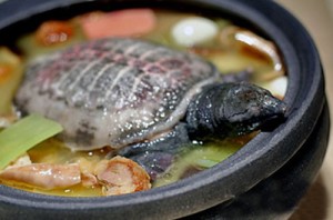 将活甲鱼用开水烫死,去内脏。将鳖甲、头、颈、爪放入锅内,加生姜、葱、胡椒粉武火烧沸,改文火将鳖甲肉煮熟,加入洗净之猪脊髓煮熟,加味精即成。喝汤吃肉。...