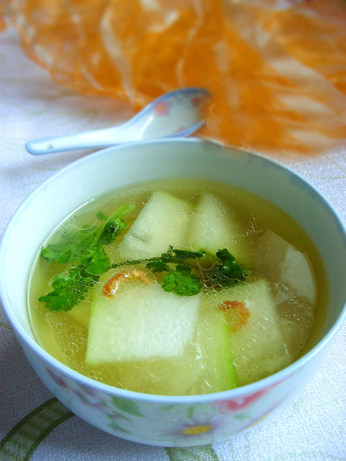 冬瓜 富含维生素(维生素食品)B,皮、肉皆可入药,民间有“冬瓜入户,不进药铺”之说。小便不畅,饮冬瓜汤最有疗效。老人夏天消化不良,用冬瓜与莲子、百合和鸭子煮汤饮,能消暑开胃。